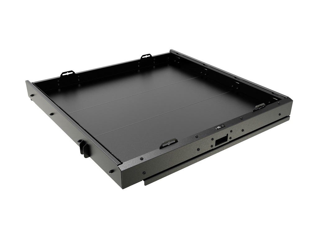 This “flat drawer” can hold a refrigerator along with chairs, cargo boxes, and other gear. Or it can simply be used to easily access groceries and other everyday items.Secure up to a 52L (or equivalent) size fridge, with additional room for storage — such as the Front Runner Wolf Packs or Cub Boxes, tents, chairs, camp kitchen items, tool kits, etc. Mounts to the existing tie down points in the bed of the JKU and does NOT REQUIRE DRILLING into your 2011 + Jeep Wrangler JKU. “Push to close” dual latching lock securely keeps the unit closed and rattle-free. Works with the factory Sub Woofer in place. When extended, 100% full access to the storage cubby. Features multiple tie down points for Stratchits or many other style straps. Load Rating: 113 kg / 250 lbs. Finished with the same durable black powder coating as Front Runner Roof Racks and other Front Runner products. The Front Runner JK Cargo Slide is the perfect companion to the VACC021. If you own a 2007 – 2010 JKU, installation of this product requires drilling 2 9mm holes into the body of your vehicle. See Installation Instructions for more details. This product was not designed for 2-Door JK models.All Front Runner Storage Systems are backed by a 2 year warranty. Note: Fridges or other storage containers are not included when purchasing this Cargo Slide and are sold separately.